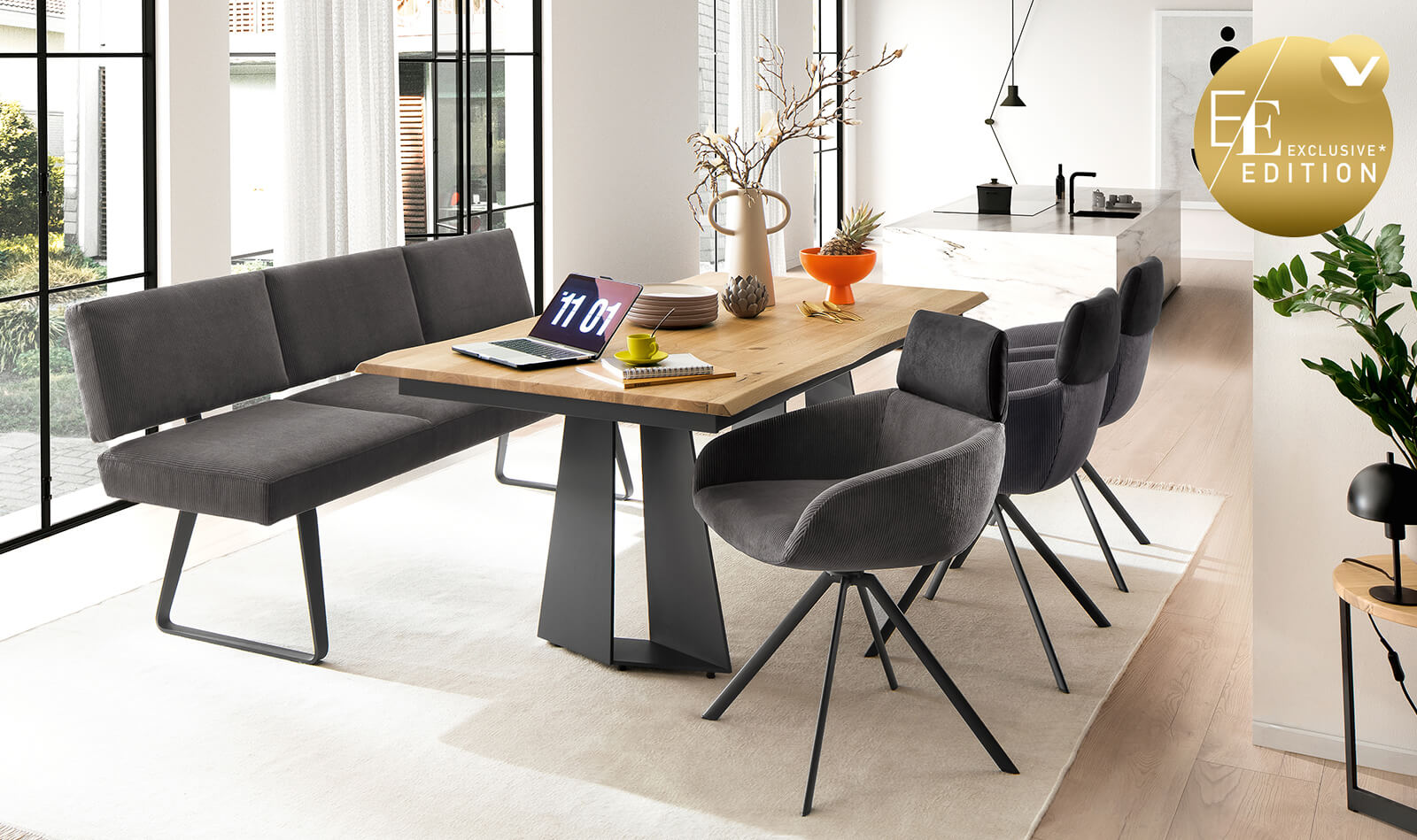 Um sich für einzigartiges Design zu entscheiden, genügt bei VENJAKOB-Möbeln oft ein einziger Blick – ein starkes Detail genau wie bei der Solitärbank SAPHIR*.