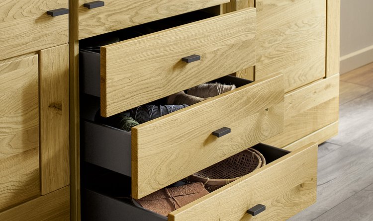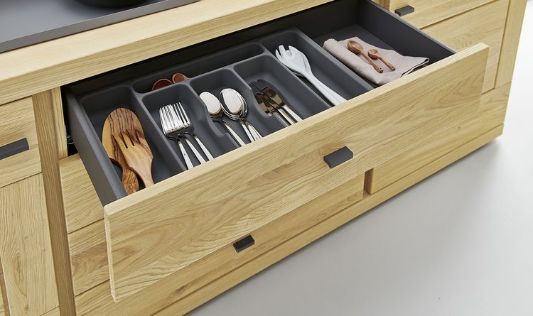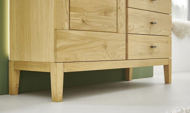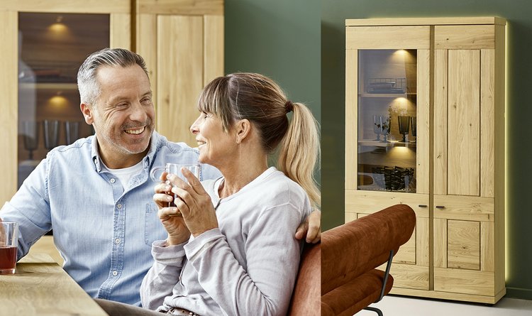 Weil ein Essplatz viel mehr ist als nur eine Anrichte für Speisen, hat Venjakob dem geschmackvollen Tafeln ein Upgrade verpasst. Venjakob NEXT LEVEL 3000 gibt der klassischen Kassettenoptik bei der Einrichtung ein neues Gesicht und lenkt die Aufmerksamkeit auf Linienführung und Material. Vitrinen, Lowboard und Regalelement um den Essplatz bestechen dabei durch ihre edlen Massivholzfronten in Wildeiche hell, die bei Venjakob immer mehrfach geölt und soft gebürstet sind.