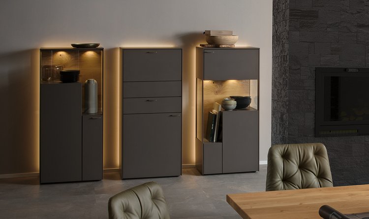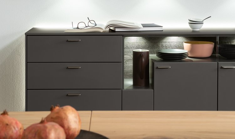 Traumauswahl fürs Esszimmer: mit Lack schiefergrau matt und Lack kristallweiß matt. Erleben Sie einen echten Venjakob-Klassiker, der mit spektakulären Ansichten und transparenten Einsichten brilliert. Faszinierend: die integrierten Glastüren über Eck. Aufregend: die stilsicheren Materialkombinationen. Bestes Beispiel: die eleganten Aluleisten in metallfarbig matt, kristallweiß matt und schiefergrau matt. SENTINO 3000 ist ein Genuss fürs Auge – und das isst ja bekanntlich mit.