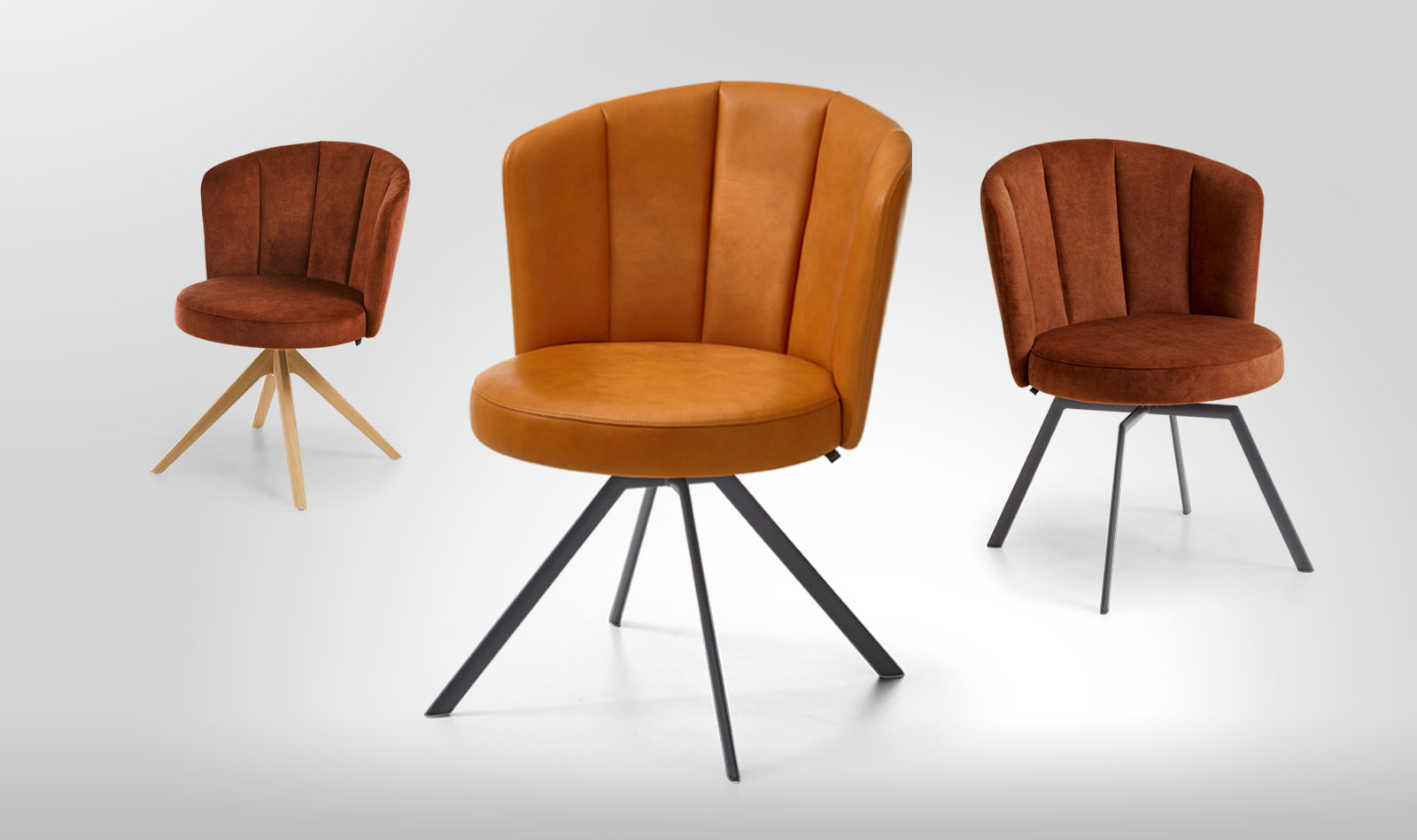 Lieferbar mit Stoff- und Leder-Bezügen. Optional mit Drehfunktion und/oder Schwingfunktion.