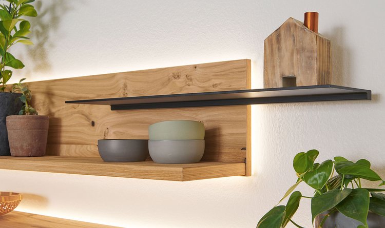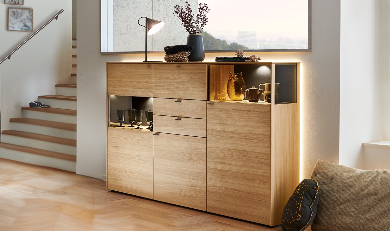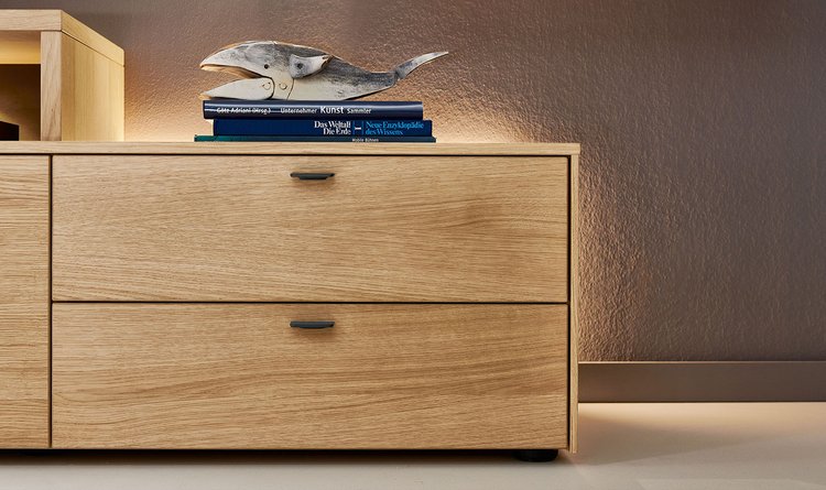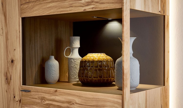 In der PLAN X Programmwelt ist X3 „das Natürliche“. Das Eiche-Echtholzfurnier ist fein gemasert und sanft strukturiert – Holz pur für harmonisches Design, das Ihrem natürlichen Einrichtungsstil entspricht. Dazu kommen detailverliebte Akzente in der Rückwand: Matt lackierte Flächen oder Holz-Elemente setzen sanfte Kontraste und werden von dimmbaren LED-Leuchten in Szene gesetzt. Entscheiden Sie sich bei X3 für eine Möbelausführung in Eiche rustico hell oder Eiche hell geölt, freuen Sie sich auf eine attraktive LED-Fach- und Ambiente-Beleuchtung sowie Schubkästen mit Selbsteinzug.