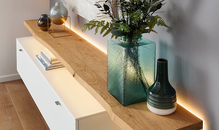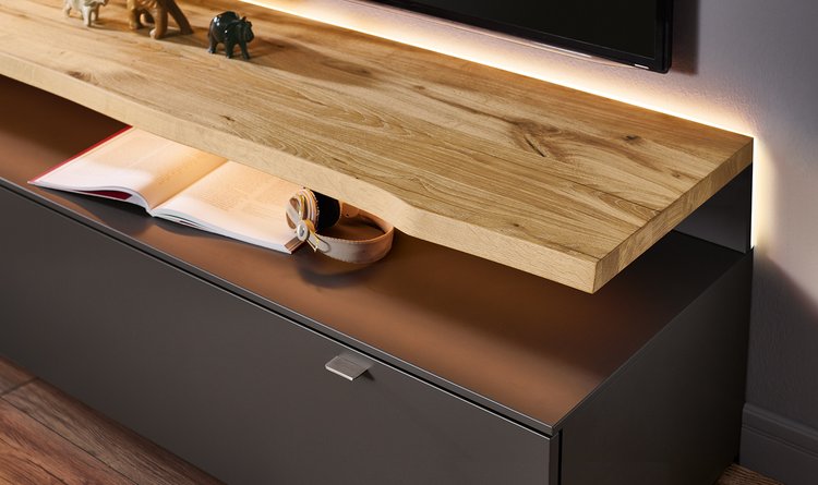 Holz trifft Lack, Natur trifft Design, Wohlgefühl trifft Wohngefühl: X5 kombiniert das Beste aus zwei Welten. Und zeigt dabei Kante – auf die elegante Art. Der Clou dabei sind die traumhaft schönen Deckblätter mit Baumkantenoptik, deren natürliche und bewusst unregelmäßige Linienführung einen aufregenden Kontrapunkt zur klaren PLAN X-Designsprache setzt.