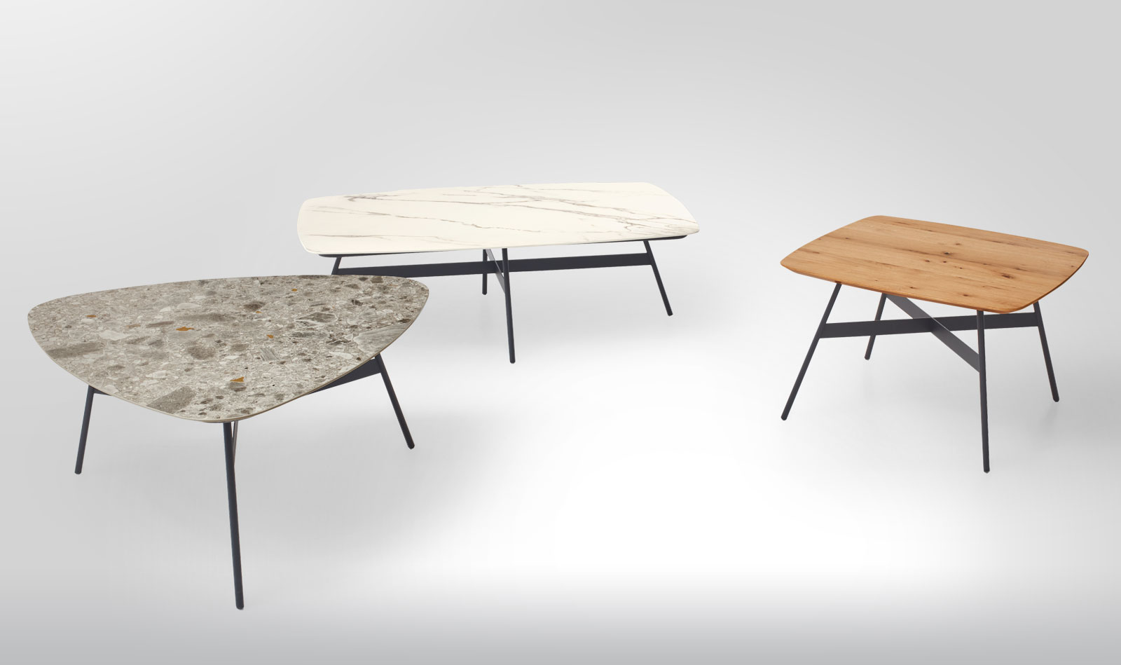 Couchtisch-Serie COPPA in 5 Formen, 8 Größen, mit Keramik-, Glas- oder Holzplatte.